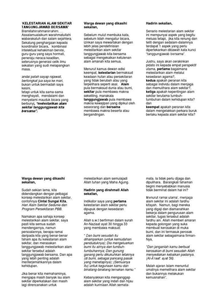 Kita harus menjaga kebersihan alam sekitar supaya kita tidak jatuh sakitKalau udara kita kotor kita tidak boleh bernafasJangan membuang sampah di kolam kerana ia boleh menjejaskan ikan-ikan yang ada dalam kolam ituKita harus membuang sampah di dalam tong sampahKalau kita menjaga alam sekitarkita hidup aman. Informasi tentang kelestarian alam dan membangkitkan kepedulian terhadap kebersihan lingkungan. Matikan peralatan elektronok dan lampu yang tidak Anda gunakan.